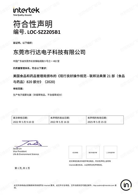 本文來源:驗(yàn)廠之家 - 祝賀東莞市行達(dá)電子科技有限公司2022年順利通過電子煙GMP 820認(rèn)證