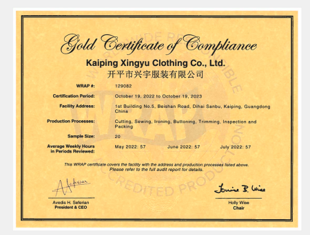 本文來源:驗廠之家 - 祝賀開平市興宇服裝有限公司2022年順利通過WRAP認證