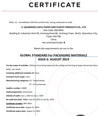 本文來源:驗廠之家 - 祝賀泉州大宇包裝制品有限公司2024年順利通過FSC認證、BRC認證、SEDEX-4p驗廠審核