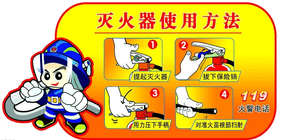拔下保險梢,握住軟管,對準火源根部,壓下手柄滅火。