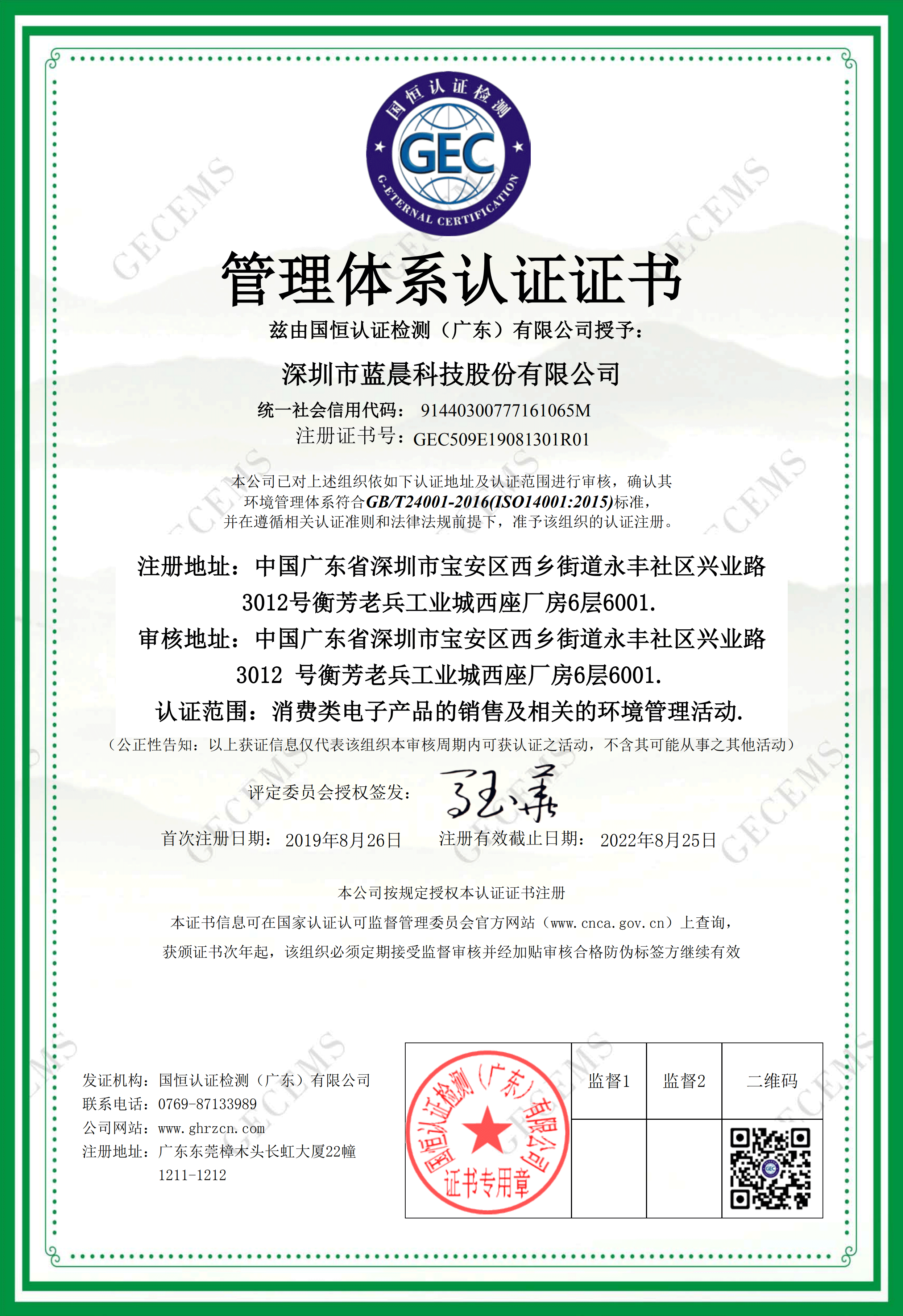 祝賀深圳市藍晨科技股份有限公司順利通過GEC機構ISO14001認證