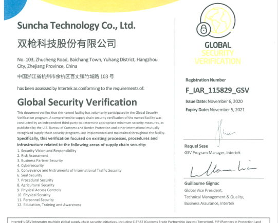 本文來源:驗廠之家 - 恭賀雙槍科技股份有限公司一次性通ITS 新版GSV認證