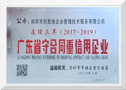 3222次 2020-08-06 作者:驗廠之家2017-2019年連續(xù)三年榮獲”廣東省守合同重信用企業(yè)“榮譽證書
